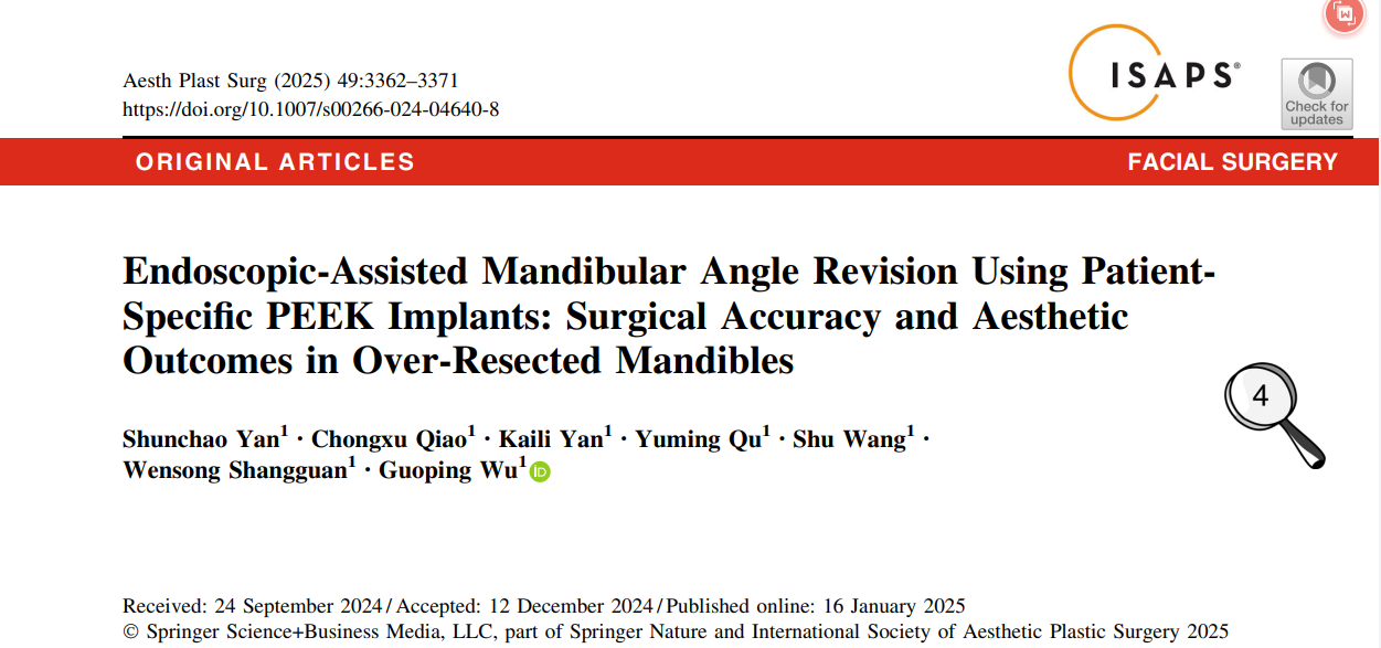 针对下颌角截骨术(Mandibular angle osteotomy ,MAO)后可能出现的过度截骨导致的功能与美学缺陷,吴国平教授为通信作者、闫顺超医师为第一作者论文《Endoscopic-Assisted Mandibular Angle Revision Using PatientSpecific PEEK Implants: Surgical Accuracy and Aesthetic Outcomes in Over-Resected Mandibles》发表于《Aesthetic Plastic Surgery》2025年第49卷第12期。 研究探索了内镜辅助下使用患者特异性聚醚醚酮(Polyetheretherketone,PEEK)植入物进行下颌角修复术(mandibular angle revision,MAR)的疗效。该回顾性研究显示,基于虚拟手术规划(virtual surgical planning,VSP)和3D打印技术定制的PEEK植入物,在手术中实现了极高的贴合精度,96%的植入物与预设位置的偏差小于0.3毫米。术后患者面部外观(如下颌轮廓)和心理状态相关的FACE-Q评分均得到显著提升,且植入物贴合精度与患者对容貌改善的满意度呈强负相关。这项研究证实,内镜技术与定制化PEEK植入物的结合,为“过度截骨”这一临床难题提供了精准、可预测的解决方案。这不仅极大提升了修复手术的可控性与效果稳定性,更能显著改善患者因轮廓缺陷导致的心理困扰,实现了从形态修复到身心重塑的跨越。